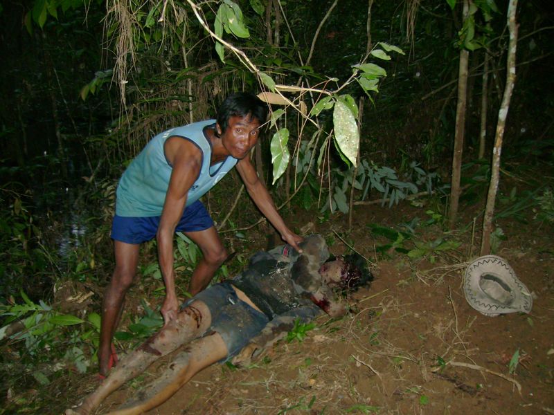 Fortunately, when Yai and I arrived at the location of this most recent accident, we were spared the gruesome sight of the man’s bomb-torn body.  By the time we got to the site, his friends had already wrapped him in a blue plastic tarp and lashed him to a pole, getting ready to carry him out of the forest and onto the road for home.