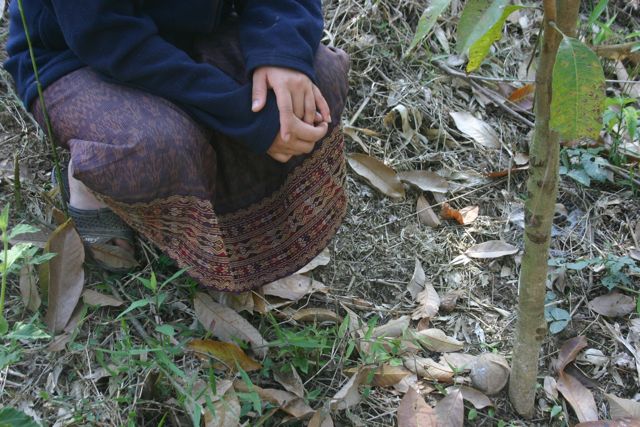 Today we the headed back to Sop Houn to destroy ordnance that villagers showed us last week. We started with a cluster bomb in a tree plantation. The woman who found the bomblet often carries her children with her to the fields so she can tend to their needs while she gardens; the kids were with her the day she happened upon the bombie.