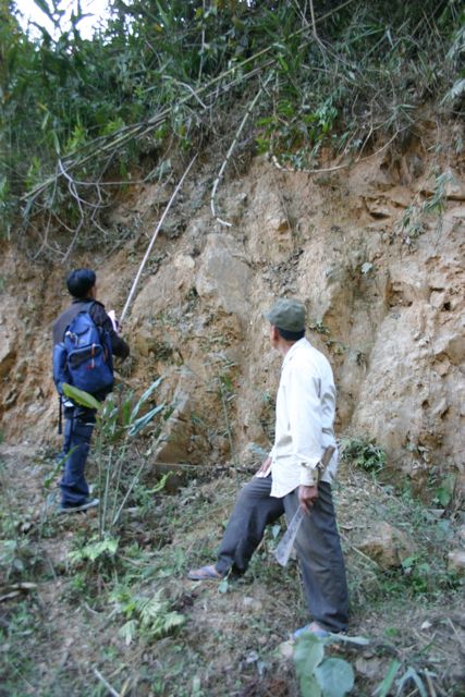 After Mr. Bouncham told us his story we agreed to restore his land. We’re searching his garden, the hillside, and the land between. We’re not done yet but we’ve already found twenty-seven bomblets at ground level. We can see another ten stuck in the clay bank. Some bomblets appear to be firmly in place (at least until the next rainfall); others look ready to drop at any moment.