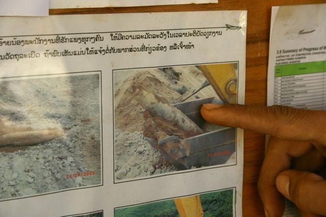 Photos outside the Lao Construction Consortium office show photos of bombs unearthed by company excavators. (See closeup below)