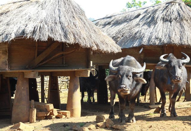 After a cluster bomb casing left the airplane it split in two and dispersed as many as 670 cluster bomblets. The casings halves then fell to earth. Today, people still find them and put them to use. Here, farmers have used them as supports for their elevated rice storage bins. They'll support a lot of weight and are difficult for rats to climb.