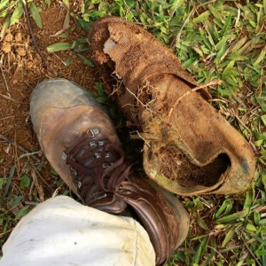 When we do find bones or teeth or whatever, we usually work around them and then re-bury what we have had to expose. What alarmed me about the stuff I photographed was that the canteen and the belt buckle were not familiar to us. And most interestingly, the boot was the size of my foot, easily a size 11. I’ve never seen an Asian with a foot that big!